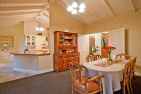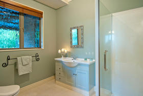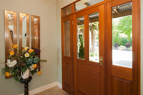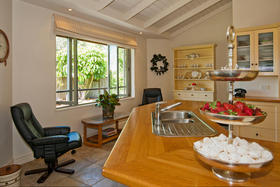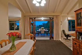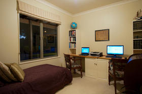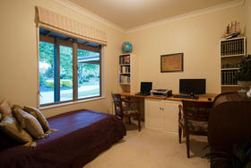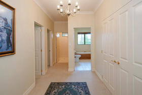 This is a home equally well designed for family or for a couple who welcome guests to stay. The master suite and a large office or fourth bedroom are situated on one side, with an easy relationship with the living areas, while the family or guest bedrooms occupy the opposite corner, where they can be 'closed off' when not used while life continues in the rest of the home. The main foyer is the linking factor- French doors into the living straight ahead, to the side a wide hall (more like a second foyer) off which are two bedrooms, bathroom and separate tiled shower room. Wardrobes are spacious and hall storage could hide a grandchild or two!