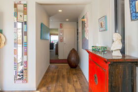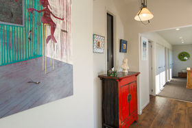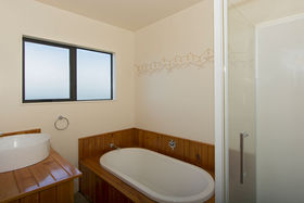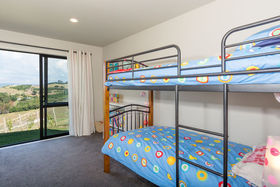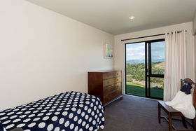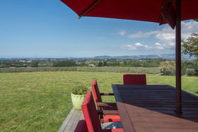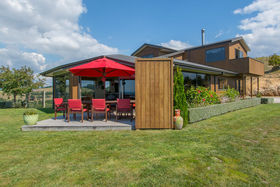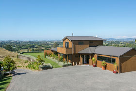 The master suite with its own balcony and fifth bedroom are privately above while three more bedrooms and office fan off the lower hall where macrocarpa features in the family bathroom and the laundry is the size you'd want in the country.