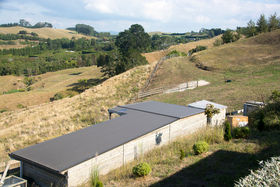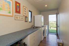 The sophisticated rustic Shadowclad home overlooks its 4.6125ha of grazing that curves below and slightly beyond it. Living wraps the view frontage with inspiring outlook from every window. Tile look concrete flooring is a practical, energy efficient, option for the kitchen, dining and family area where children and dogs will run in and out to and from the lawn all day. Carpeted living space is backed by a warm solid fuel fire for winter warmth and there is a sheltered deck outside for summer evenings watching the sunsets and the city lights.