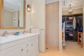 Downstairs, two more bedrooms each with an ensuite, is split by a third living room, all opening to a sheltered and private courtyard with water feature. That makes a total four bedrooms with four bathrooms, carefully planned for complete privacy. An office or fifth bedroom, separate laundry and double garage complete downstairs along with lots of extra parking.