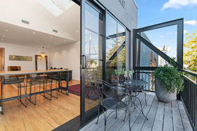 Looking out over Willow street, the comprehensive conversion from what was offices into a loft style apartment has a NYC vibe styled with contemporary, casual luxury. Enter through the front lobby to high ceilings, over height doors and light flooded, spacious living. A pitched ceiling over the kitchen/living area has a bank of skylights that bathe the room in all day sun, with large sliding doors opening onto a sizable east facing deck, while skylights throughout the rest of the apartment let natural light into each room.