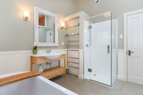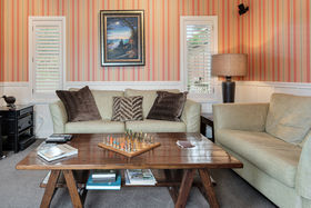 Three large bedrooms have retained their original charm with one currently used as an office with bespoke bookshelves carefully housing a tilt-away bed perfect for occasional guests. The family bathroom across the hall is generously sized and complete with a deep claw foot bath, extensive custom designed storage and adjacent chic powder room. At the end of the long hall, step up to the peaceful haven of the private master suite opening out to a private sheltered courtyard, soothed by the serenity of gently flowing water. A second lounge is warmed with a log gas fire keeping it snug and cosy and opening to a harbour facing deck with more water views.