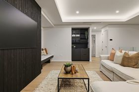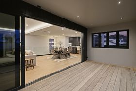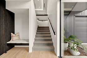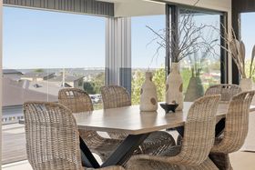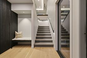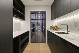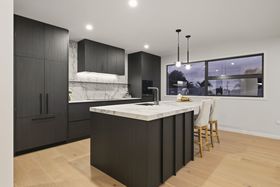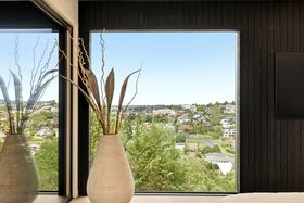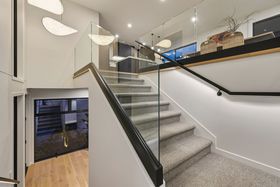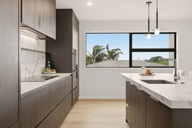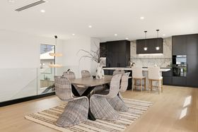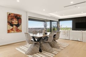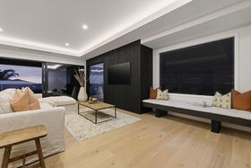 Step inside to a world of monochromatic elegance. The grand double-height entrance hall dazzles with bespoke twin-disc lighting, setting the tone for what lies beyond. A sleek, glass-balustraded staircase leads upstairs to expansive open-plan living spaces, where a backlit coffered ceiling and exquisite timber flooring highlight the home's contemporary flair. The kitchen, scullery, dining, and living zones flow seamlessly together, bathed in natural light through floor-to-ceiling windows that capture the sweeping views. Built-in seating and a wall-mounted media system enhance the sense of calm sophistication.